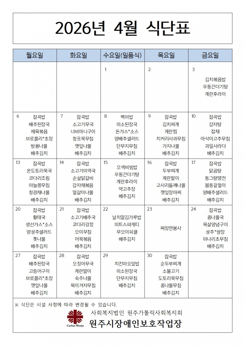 원주시장애인보호작업장 2026년 4월 식단표입니다.